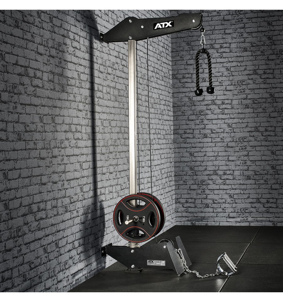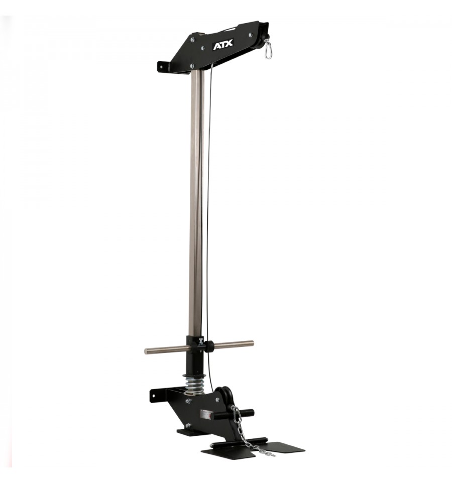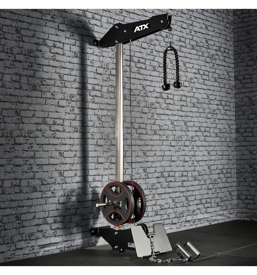 Naprawdę praktyczny i niezwykle kompaktowy wyciąg do ćwiczeń mięśnia najszerszego pleców z uchwytami na obciążenie talerzowe (standardowo Ø 30 mm, opcjonalnie Ø 50 mm za pomocą adaptera BB-OA-250-PVC).