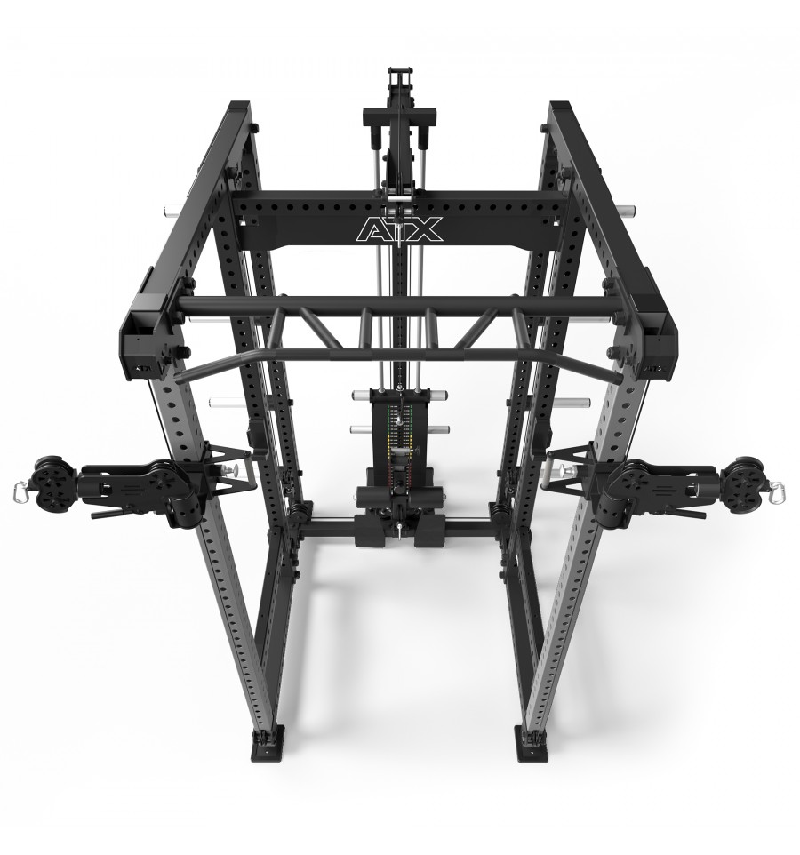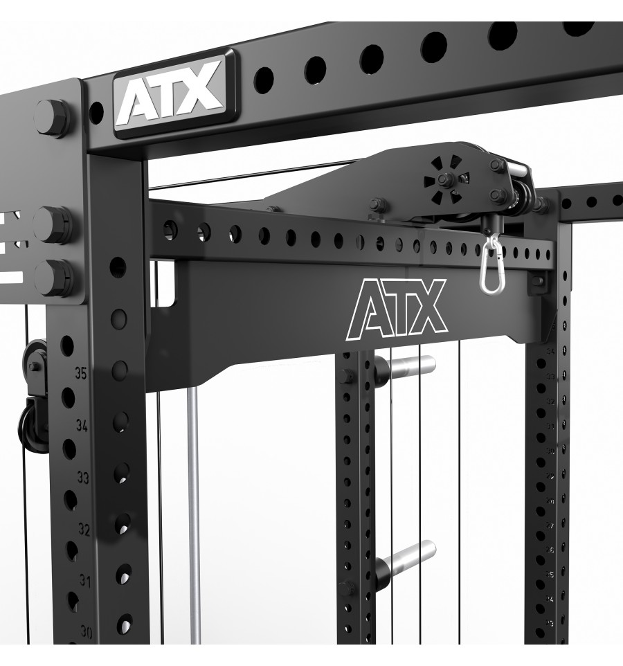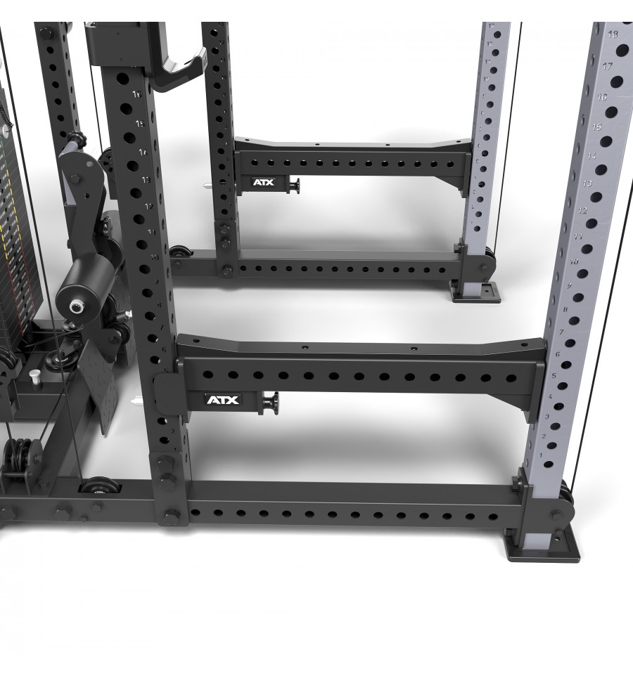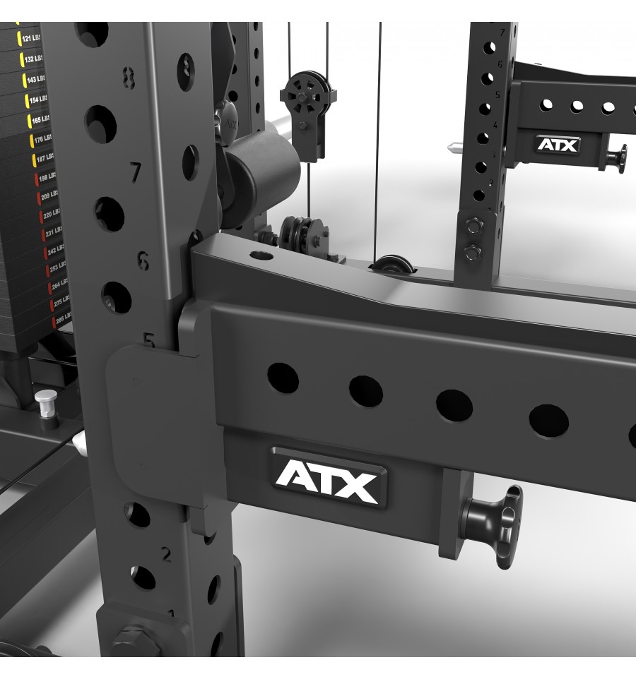 Dodatkowe wyposażenie, takie jak wielofunkcyjny drążek do podciągania, uchwyty na sztangi, 8-miejscowy uchwyt na obciążenia oraz logo ATX®, dopełniają funkcjonalność tego topowego power racka.