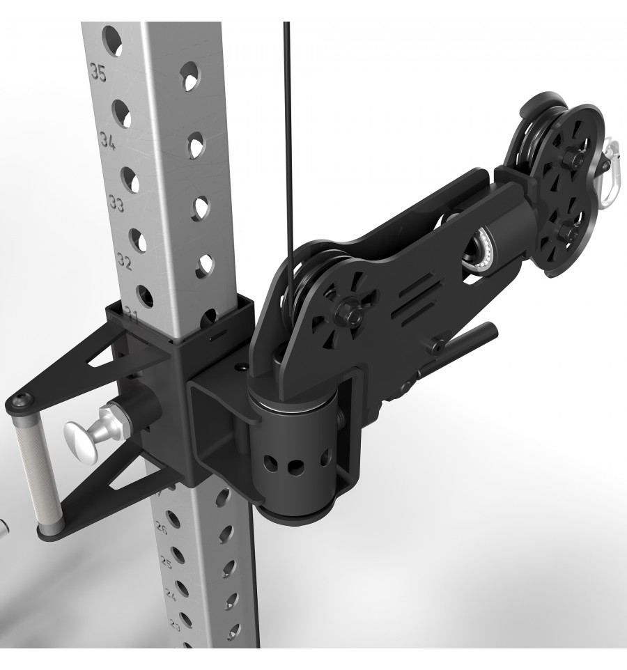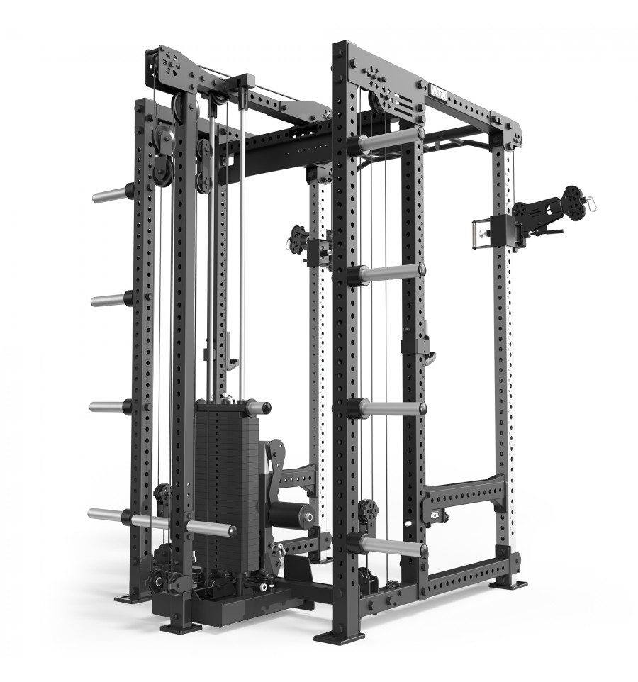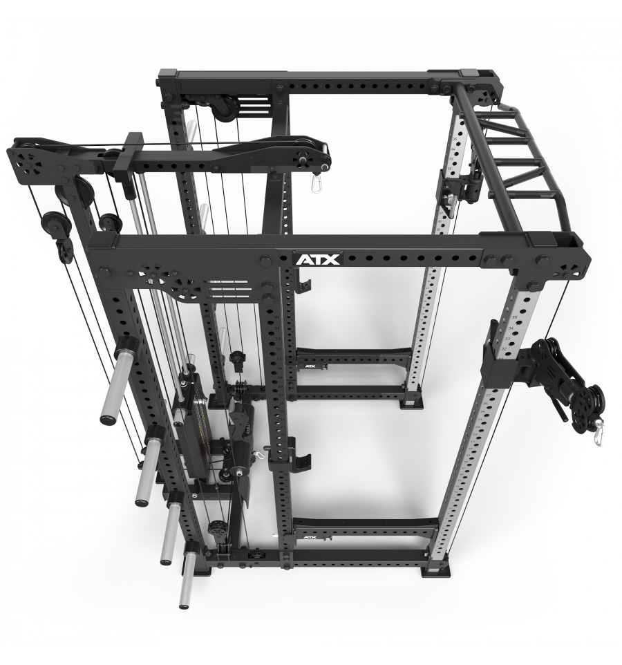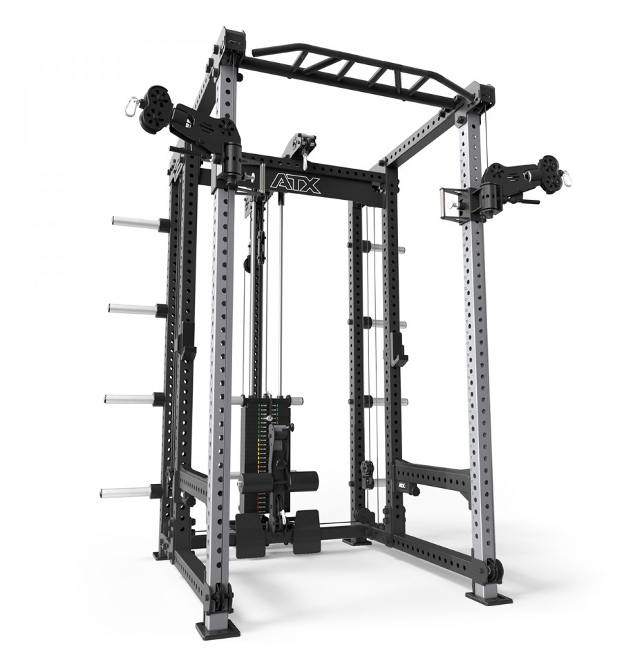 Dodatkowe wyposażenie, takie jak wielofunkcyjny drążek do podciągania, uchwyty na sztangi, 8-miejscowy uchwyt na obciążenia oraz logo ATX®, dopełniają funkcjonalność tego topowego power racka.